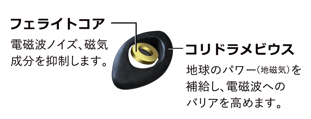 | 丸山先生の研究・開発により考案された「コリドラ・アイ」はフェライト由来のメビウスと、電磁波ノイズや磁気成分を抑制するフェライトコアを組み合わせることで、地球のパワーを補給し、電磁波へのバリア力を高めます。 |